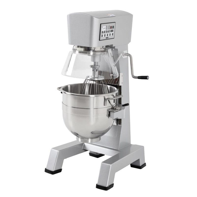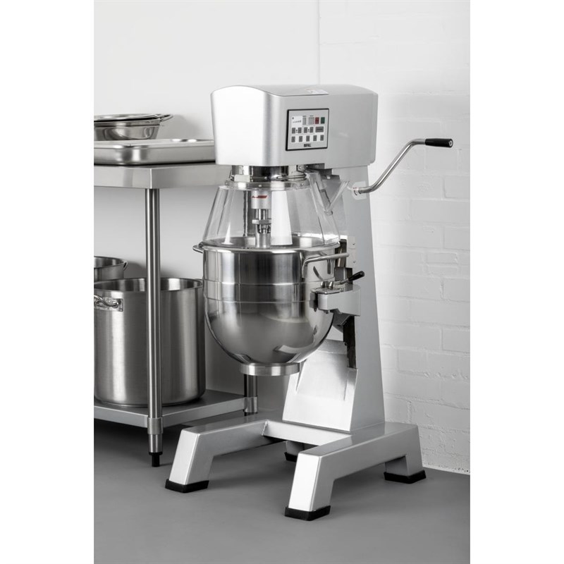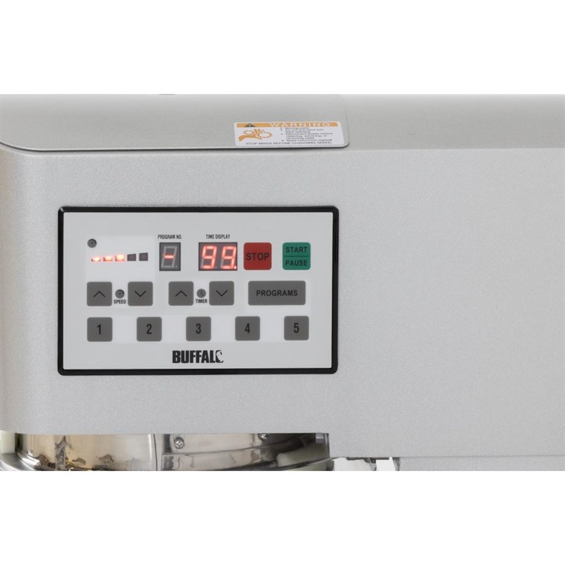 De Buffalo 30Ltr digitale planeetmenger biedt de prestaties, precisie en betrouwbaarheid die u nodig hebt om grote commerciële hoeveelheden voedsel te mengen. Dankzij de borstelloze motor van 1,5 kW met lange levensduur kan de Buffalo-mixer zelfs zware mixen verwerken, zodat u met gemak deeg, crèmes en beslag kunt verwerken. Met nieuwe en verbeterde digitale bedieningselementen beschikt de Buffalo planetaire mixer over een indrukwekkende mengflexibiliteit. In plaats van traditionele langzame, gemiddelde en hoge snelheden biedt de Buffalo-mixer u een echte traploze snelheidsregeling, zodat u kunt mixen zoals u dat wilt - essentieel voor delicate mixen of specialistische ingrediënten. Met de digitale bediening programmeer je de mixer. Met maximaal vijf door de gebruiker te definiëren programma's kunt u de mixer zo instellen dat deze langzaam start en op een bepaald tijdstip naar een andere snelheid gaat, afhankelijk van uw recept. Selecteer gewoon uw programma en de mixer geeft u elke keer een consistente, herhaalbare mix. Elk programma kan maximaal vier fasen bevatten voor maximale mengflexibiliteit. De motor van de 30 liter Buffalo planeetmenger is niet alleen energiezuinig, hij wordt ook nog eens door een riem aangedreven. Dit betekent dat hij is ontworpen om stiller te werken dan traditionele mixers en veel gemakkelijker (en sneller) te onderhouden is in vergelijking met tandwielaangedreven alternatieven.