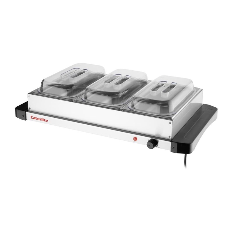 Veelzijdig en effectief, de Caterlite voedselverwarmer is perfect voor het handhaven van de temperatuur van gerechten tijdens de bediening. Of het nu een zelfbedieningsbuffet of een begeleide bediening is, de Caterlite warmhoudplaat is uitzonderlijk eenvoudig te gebruiken en kan worden geconfigureerd om tot drie 1/3 formaat gastronormbakken met voedsel tegelijk te bevatten.