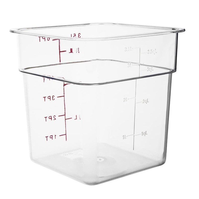 Deze ruimtebesparende, transparante polycarbonaat voedseldozen zijn bestand tegen breuk en nesten in elkaar, waardoor ze minder ruimte innemen. De dozen hebben een inhoud van 3,5L en kunnen gecombineerd worden met luchtdichte kleurcode deksels (apart verkrijgbaar). Met getextureerde bodem om schuiven tegen te gaan en een maatverdeling. Vaatwasser-, vriezer- en magnetronbestendig en bestand tegen temperaturen van -40°C tot +100°C.