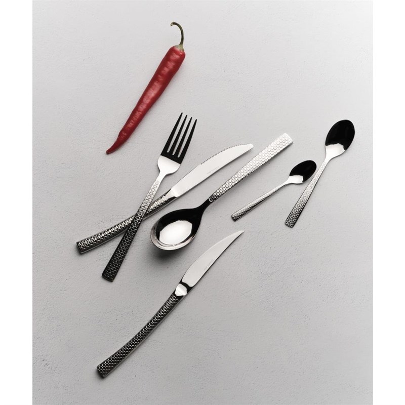 De gravure op het handvat met geometrische motieven geeft het een modernistische en elegante uitstraling. Gemaakt van Nicel Free Stainless Steel en met een spiegelende afwerking die uw presentaties laat schitteren.