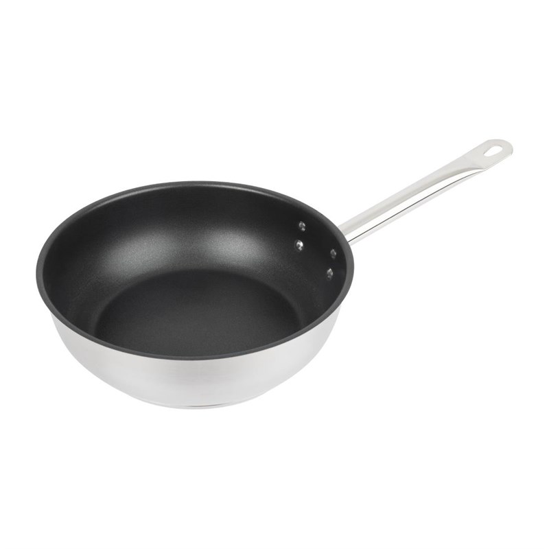 Vogue Platinum Plus sauteuses zijn perfect voor de professionele keuken, met een sterke anti-aanbaklaag, stevige RVS constructie en een geklonken handvat.