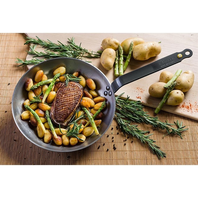Deze stalen koekenpan van De Buyer is gemaakt van 100% natuurlijk mineraal materiaal, voorzien van een organische beschermlaag van bijenwas en ideaal om producten aan te braden, te bakken en te grillen. De pan is zeer duurzaam en robuust en daarom ideaal voor gebruik in drukke, professionele keuken. Voor gebruik dient de pan wel ingebrand te worden met olie, waardoor de pan een antiaanbaklaag krijgt die mettertijd steeds beter wordt.