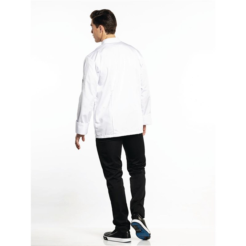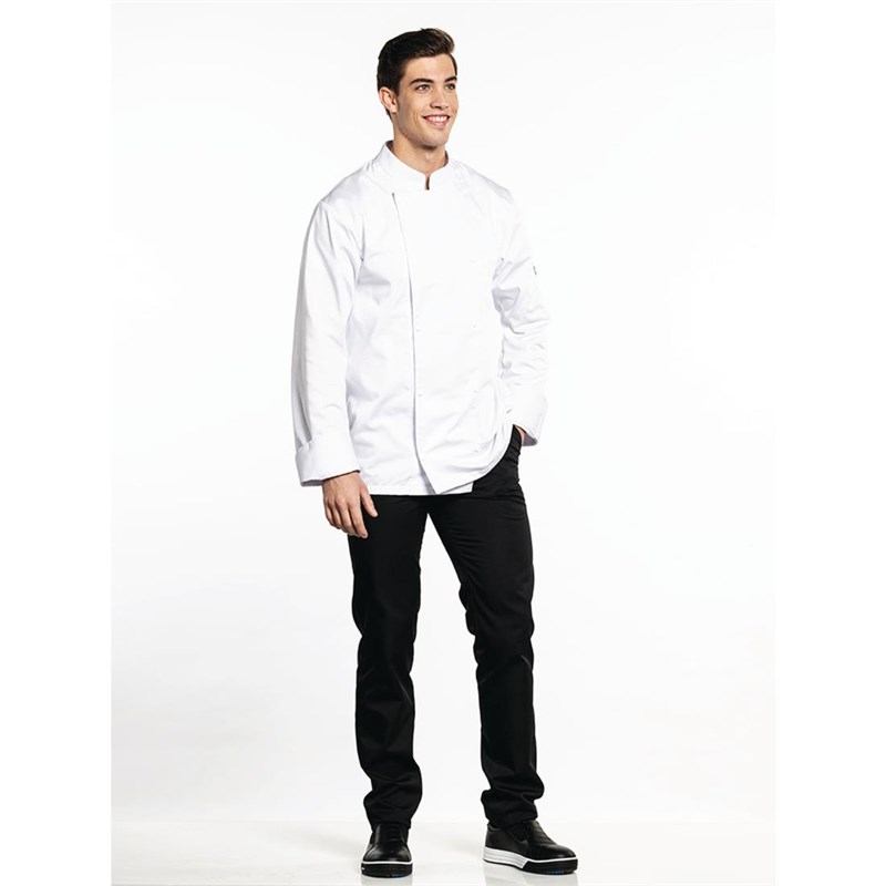 De Roma koksbuis heeft net als de Firenze een klassieke uitstraling, maar in een subtielere uitvoering. Kenmerkend aan de Roma zijn de rechte pasvorm en dubbele rij drukknopen. De koksbuis heeft daarnaast Franse manchetten en een handige borstzak. De Satin Cooltex stof is erg zacht en comfortabel. De Roma is een verfijnde uitvoering van een klassiek design.