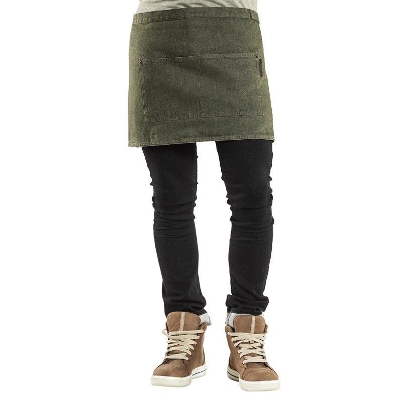 Pure Denim Collection is sterk, rauw en heeft karakter. Daarom is het de perfecte mix van mode en werkkleding. Echte denim leeft! Hoe meer je het wast, hoe meer het tot leven komt. Was en behandel het zoals je wilt. Pure Denim neemt je identiteit aan. Wees gedurfd en combineer de stijl die bij je past. De Pure Denim collectie is niet geschikt voor industriële reiniging. Houd er rekening mee dat denim af kan geven. Vermijd contact met lichtgekleurde meubels of kleding. Deze modellen zijn verkrijgbaar in de aardse tinten groen, grijs, bruin en mud. Iedereen houdt van denim! Dit stijlvolle korte schort heeft twee voorzakken in het midden. De extra lus aan de riem is een handige extra voor het bevestigen van bijvoorbeeld een Chaud Devant keukendoek.
