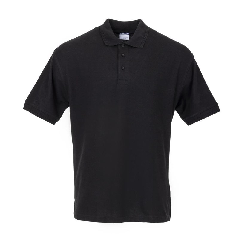 Slijtvast, zwart poloshirt van ringgesponnen polyester/katoen, voorzien van een taps toelopende hals, verstevigde schouders, ribboord mouwen en knopen in dezelfde kleur. Geschikt voor chemisch reinigen. Verkrijgbaar in de maten S t/m XL.