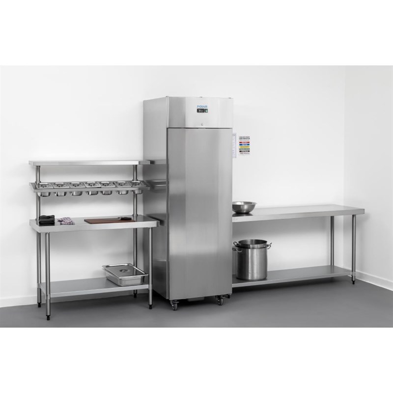 Met een royale inhoud van 700 liter (bruikbaar 490 liter) biedt de Polar U-serie staande koelkast de ideale oplossing voor restaurants die grote hoeveelheden ingrediënten willen bewaren met een minimaal stroomverbruik. De koelkast is geclassificeerd als klimaatklasse 5 en biedt indrukwekkende koelprestaties - zelfs in warme professionele keukens tot 40 °C levert de Polar betrouwbare, no-nonsense opslag. En met een A-efficiëntieklasse biedt de koelkast aanzienlijke besparingen op de gebruikskosten op de lange termijn en minimaliseert hij de impact op het milieu. Krachtige geforceerde luchtkoeling zorgt voor constante temperaturen in de hele kast, zelfs als de deur regelmatig wordt geopend. En dankzij de interne energiezuinige LED-verlichting houd je eenvoudig je voorraad in de gaten, zonder dat je alles uit de kast hoeft te halen. De koelkast uit de U-serie heeft een roestvrijstalen constructie aan de binnen- en buitenkant en is voorzien van geperste roestvrijstalen zijpanelen, waardoor er geen extra plankgeleiders nodig zijn. Met 26 plankposities met een tussenruimte van 5 cm maximaliseert de koelkast uw opslagflexibiliteit. En voor nog meer gemak kunnen gastronormbakken van volledige grootte 1/1 of dubbele grootte 2/1 aan de geleiders worden gehangen zonder dat er extra planken nodig zijn. Voor de veiligheid is de enkele deur van de koelkast afsluitbaar, en dankzij de robuuste zwenkwielen wordt het positioneren van de Polar U-Series koelkast voor schoonmaken een fluitje van een cent.
