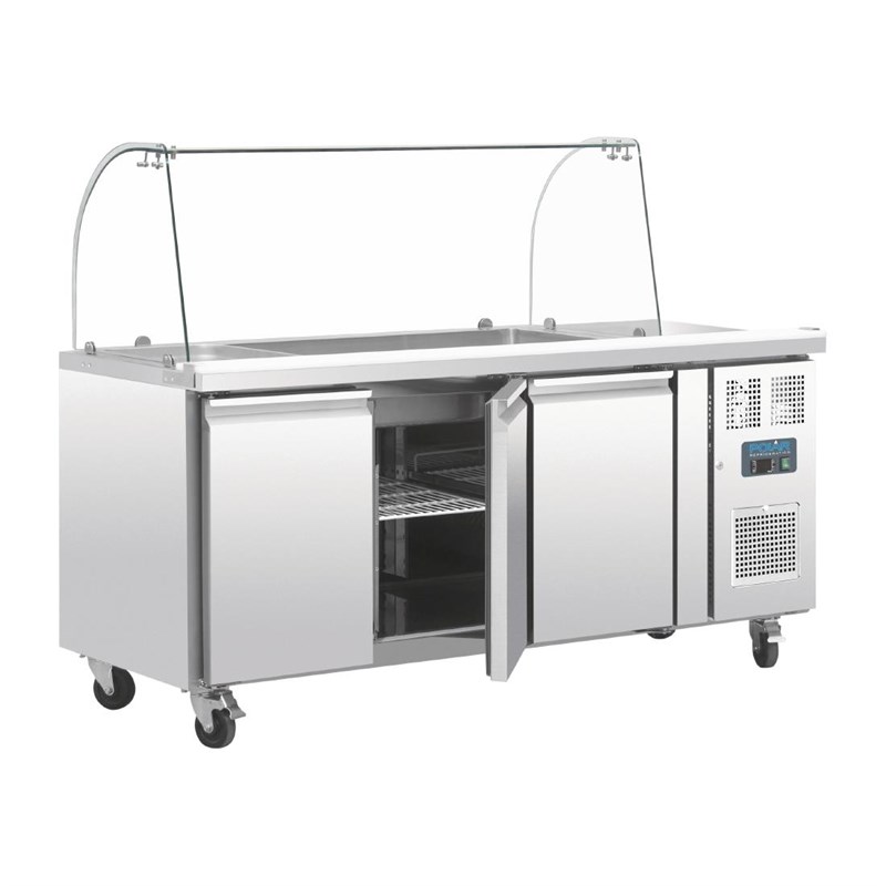 Deze saladette van Polar is een musthave voor saladebars en delicatessenzaken. De werkbank heeft een geforceerd koelsysteem, 3 roosters en is geschikt voor meerdere GN bakken zodat u voedsel op de juiste temperatuur kunt bewaren en serveren. Dankzij de glazen kap kunnen klanten wel het voedsel bekijken, maar wordt het voedsel ook beschermd tegen eventuele bacteriën. Dit komt de hygiëne ten goede. De RVS constructie maakt de saladette zeer duurzaam en robuust en geschikt voor professioneel gebruik. Gastronorm bakken worden apart verkocht.