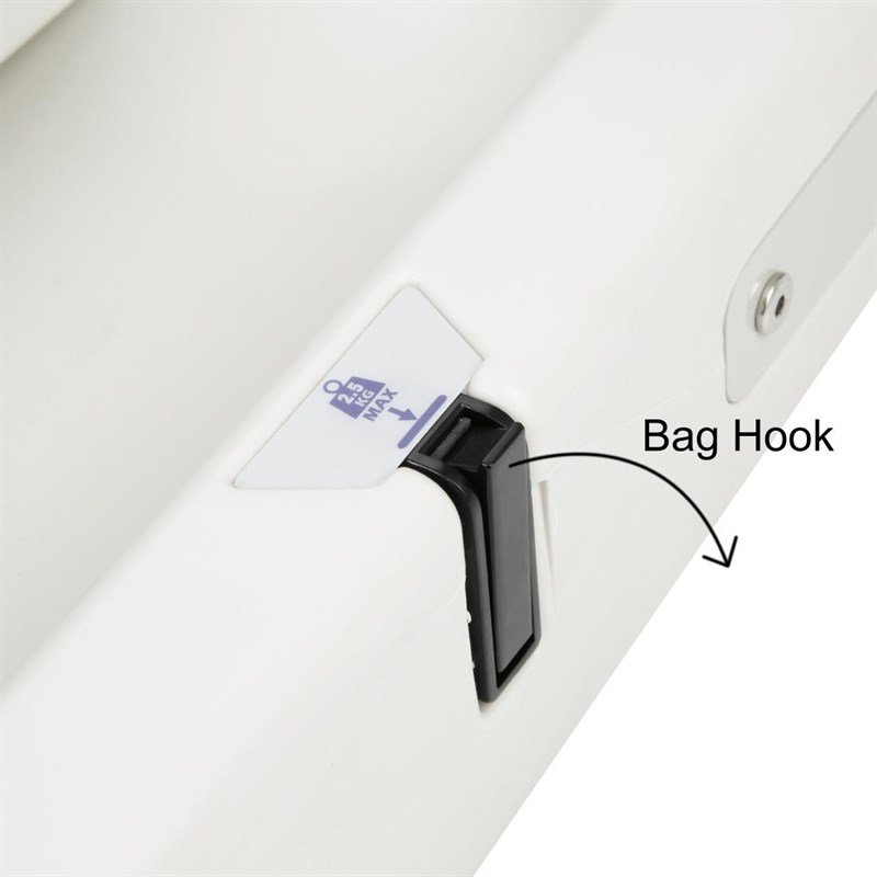 Een ingebouwde opbergbox en een haak voor de luiertas zorgen ervoor dat benodigdheden gemakkelijk binnen handbereik zijn. Stevige wandmontage zorgt voor extra stabiliteit.
