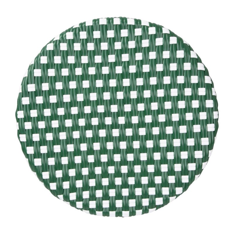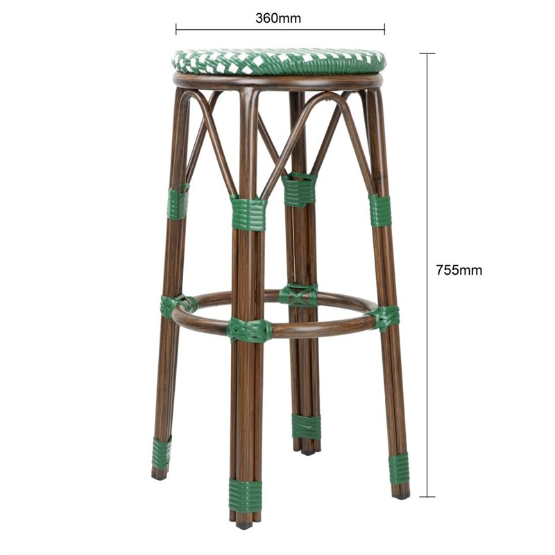 Voeg een vleugje Parijse flair toe aan uw zitgebieden met deze barkrukken in rotan-stijl van Bolero. Met een klassiek groen stippenpatroon worden deze krukken ondersteund door een licht maar stevig aluminium frame, afgewerkt met een houtnerf effect. De zittingen zijn gemaakt van duurzaam PE kunstrotan.