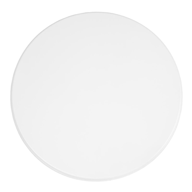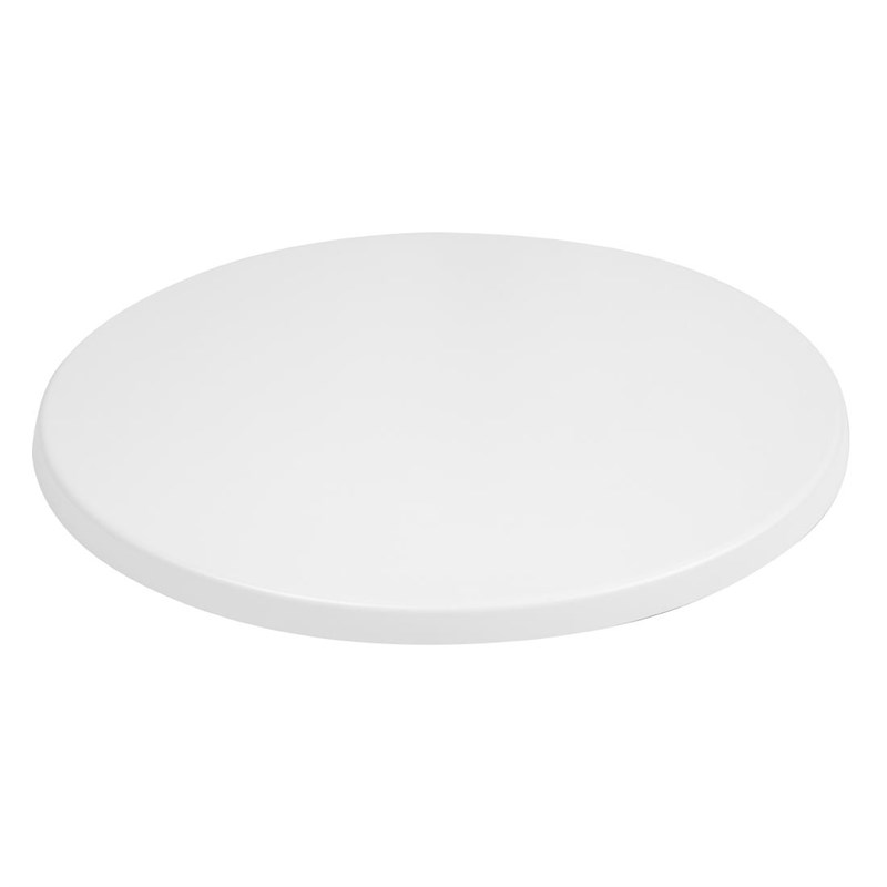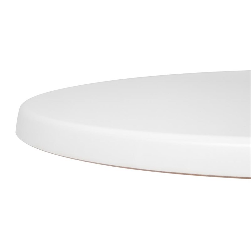 Voorgeboord, naadloos tafelblad, in het wit voor een neutrale, nette look. Het blad is hittebestendig en waterafstotend en heeft dankzij het ronde ontwerp geen scherpe hoeken waaraan iemand zich kan bezeren. Perfect voor binnengebruik in cafés, kantines en restaurants.