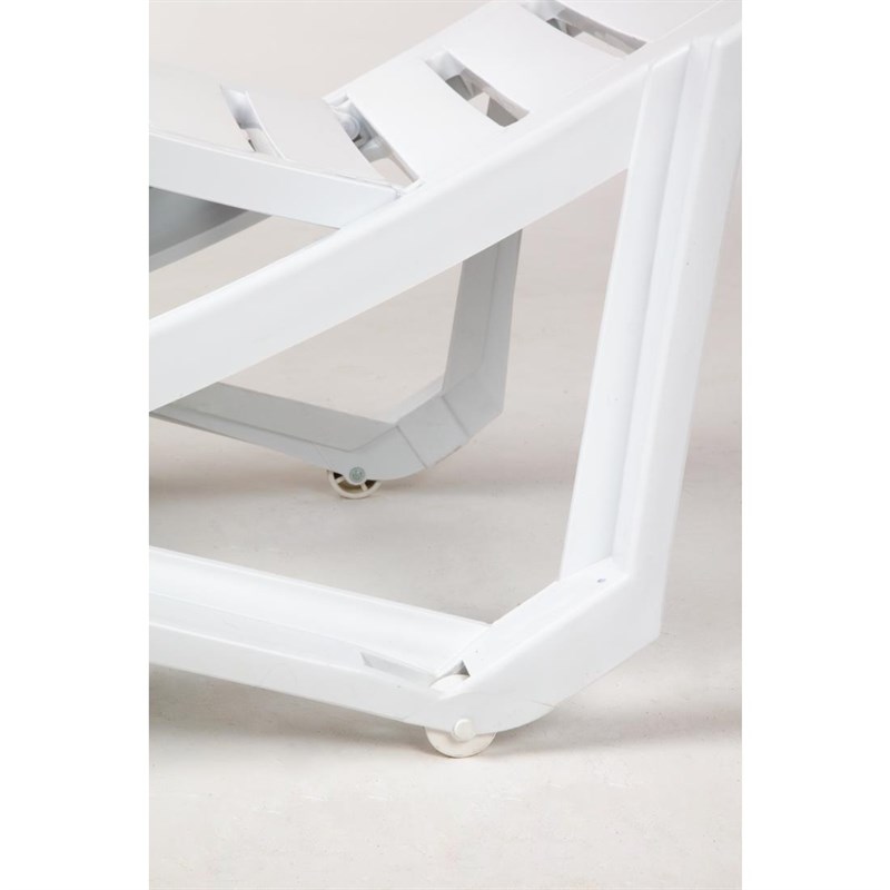 Laat gasten ontspannen in uw buitenruimtes in alle comfort met deze set van vier witte zonbedden van polypropyleen. Deze witte zonbedden zijn voorzien van een verstelbare rugleuning met vijf verschillende instellingen. Dit stelt gasten in staat om te kiezen of ze plat liggen of gewoon achterover leunen, zodat ze kunnen ontspannen en van de zon kunnen genieten in de houding die het beste bij hen past.