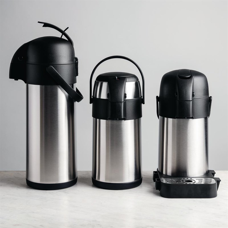 Dankzij het dubbelwandige ontwerp blijft de buitenkant van de kan veilig koel en dankzij het eenvoudig te bedienen pompmechanisme kunnen gasten ook zelf makkelijk een drankje inschenken.
