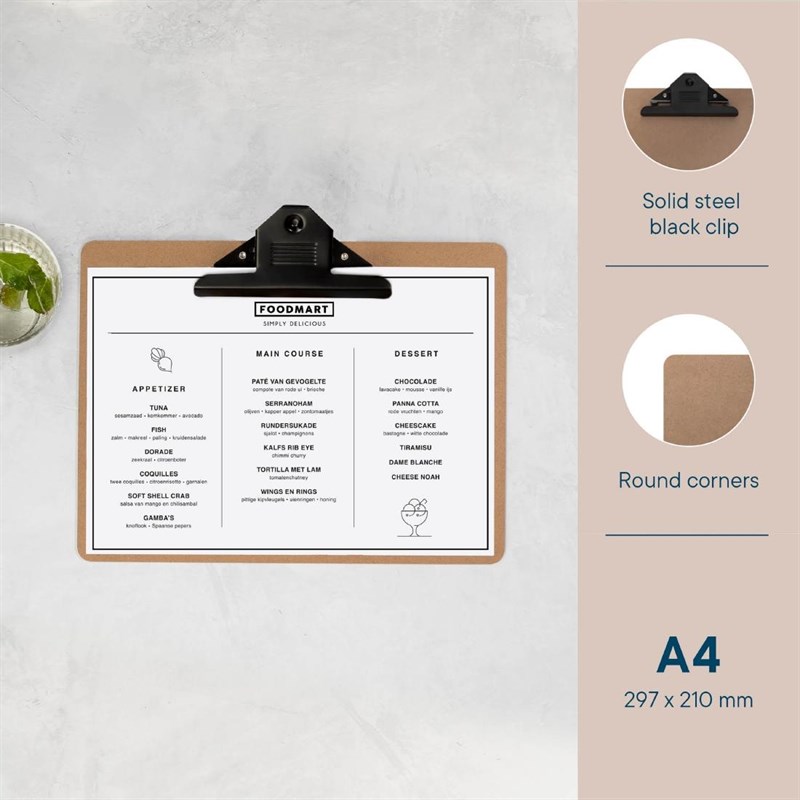 • Veilige grip: de houten klemplaat is uitgerust met een 143 mm zwarte metalen papierklem om belangrijke documenten op hun plaats te houden en netjes te organiseren.