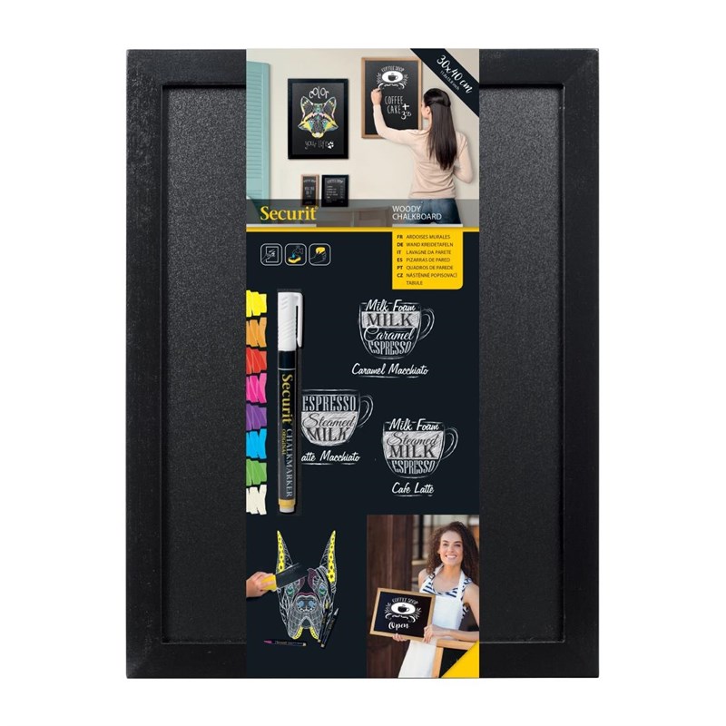 De Securit Woody is het meest geliefde ingelijste krijtbord wandbord en een geweldige manier om een unieke, trendy en effectieve display of interieurdecoratie te creëren. Deze wandplaat van 30x40 met een zwarte lijst in houten stijl wordt geleverd met bevestigingsmateriaal.