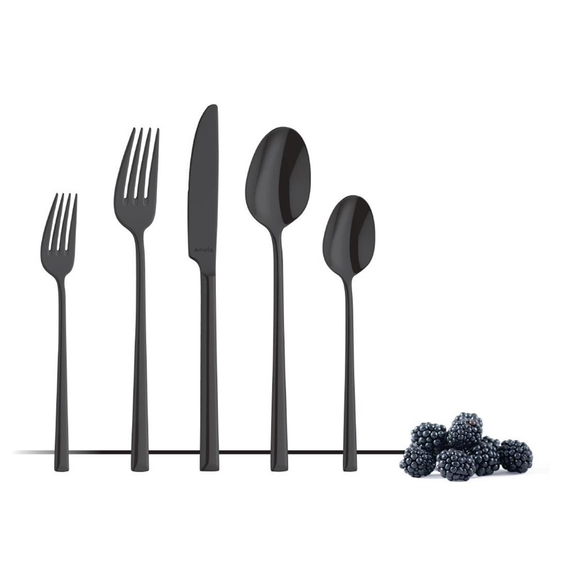 Het ontwerp van bestekmodel Metropole van Amefa is gebaseerd op hedendaagse stedelijke architectuur en heeft een luxe en moderne uitstraling. Dit zie je terug in de lange, slanke lijnen en het schuine handvat aan de onderkant. Om de hoogglans zwarte kleur te bereiken is het hoogwaardige 18-10 roestvrij staal afgewerkt met een dunne, voedselveilige titaniumcoating die zorgt voor een levendige kleur.