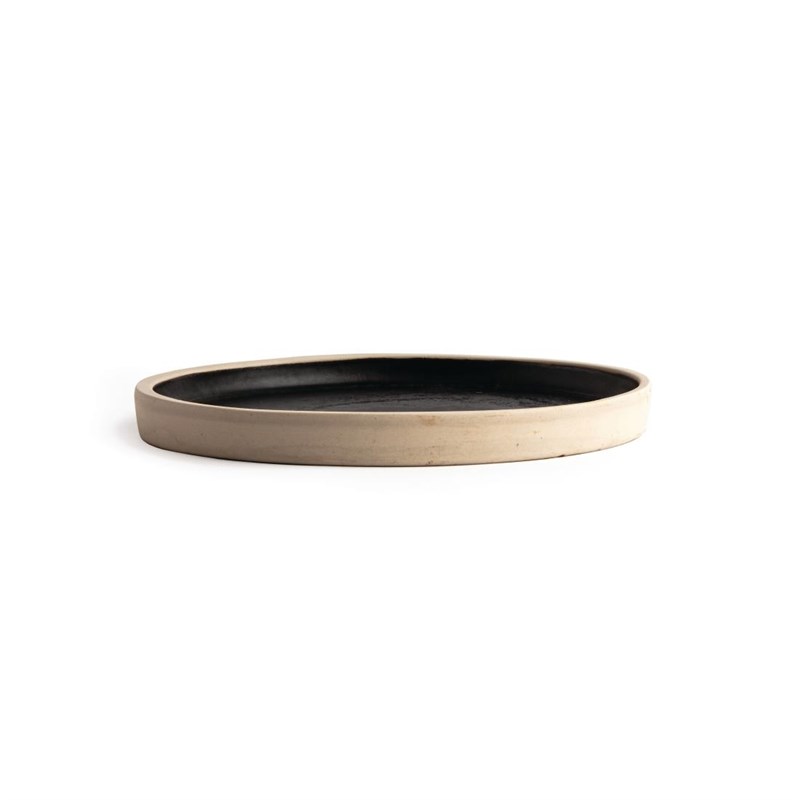 Deze platte borden van Olympia Canvas zijn zwart van kleur met een constrasterende, ongeglazuurde rand - servies dat gemaakt is om op te vallen.