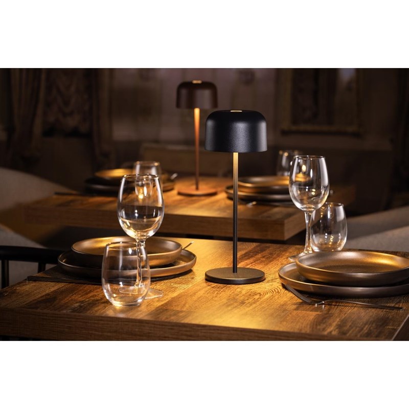 Creëer de perfecte sfeerverlichting met de Siena zwarte tafellamp van Olympia. Het draadloze ontwerp geeft je de vrijheid om het overal te plaatsen, zowel binnen als buiten. Met energiezuinige lampen biedt het langdurige verlichting en creëert het een uitnodigende sfeer, waardoor het ideaal is voor terrastafels, hotelkamers, bars en ontvangstruimtes.