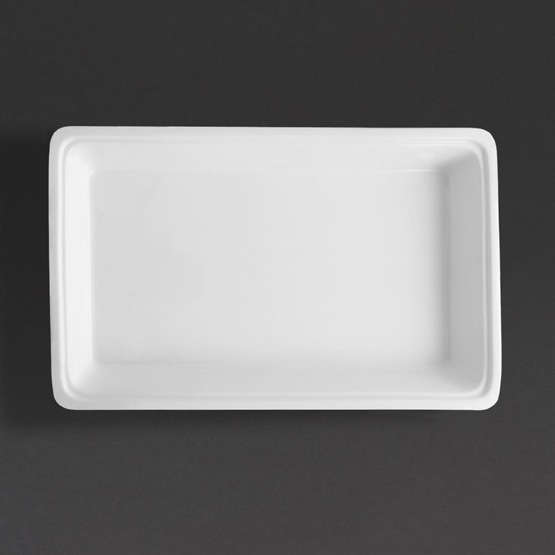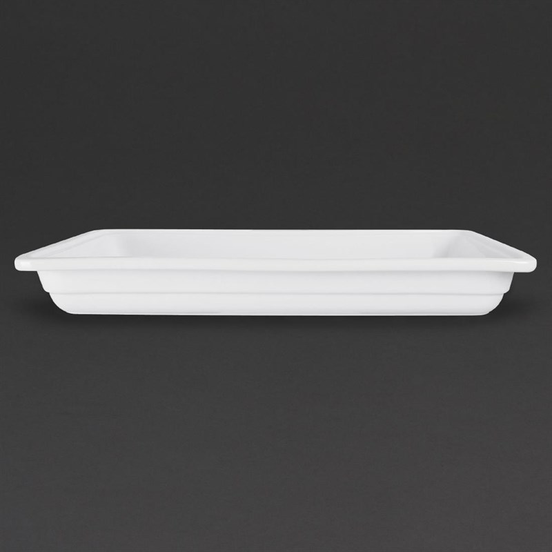 Wit porseleinen GN 1/1 schaal van Olympia, 65 mm diep. Geschikt voor de bereiding, presentatie en opslag van warme of koude gerechten. Kan tevens gebruikt worden als praktisch en stijlvol alternatief voor traditionele RVS pannen.