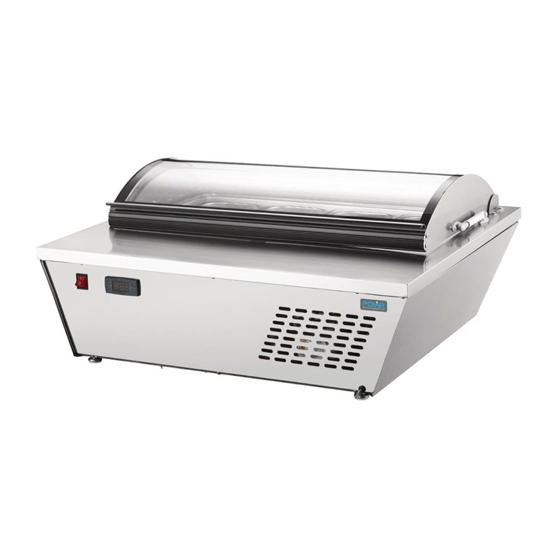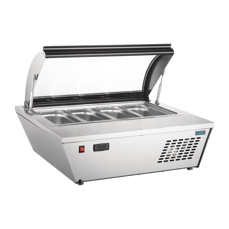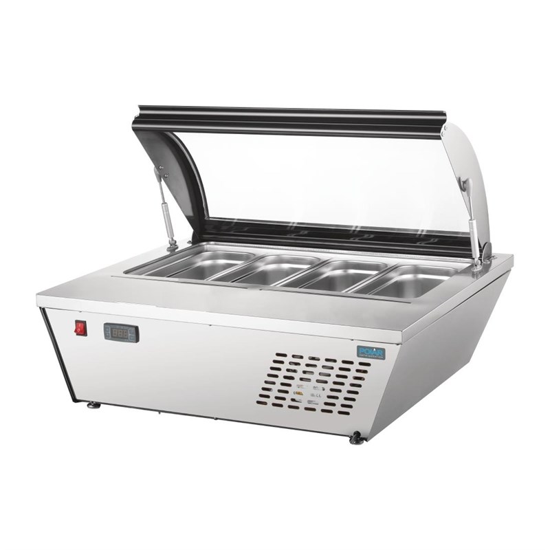 Deze schepijsvitrine van Polar is ideaal om ijs te serveren in de front-of-house, met 4 Napoli ijs-uitschepbakken. De krachtige koeling zorgt voor een constante temperatuur, waardoor de smaak, versheid en hygiëne van uw producten optimaal is. De opzetvriezer heeft een glazen deksel, waardoor het ijs beschermd blijft en goed zichtbaar is, waardoor impulsverkopen gestimuleerd worden.