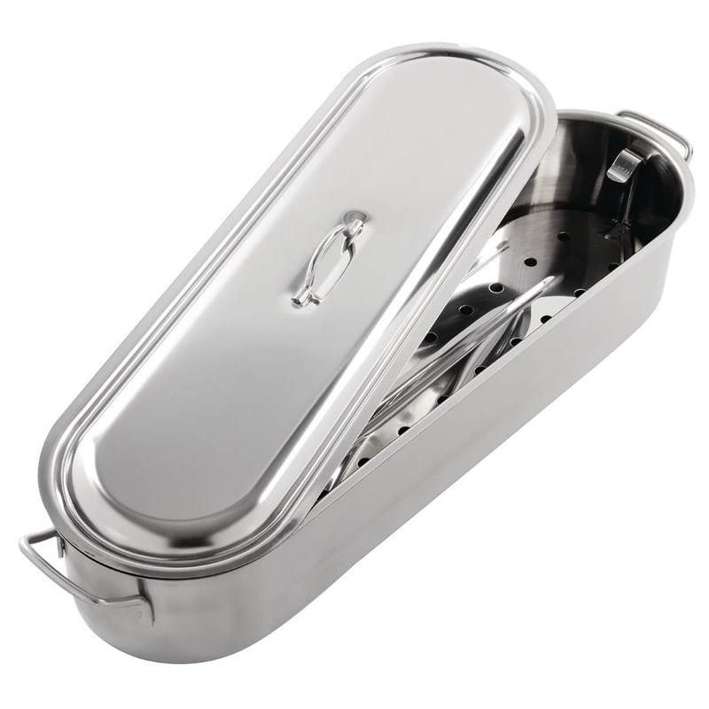 Vispan met inzet om heerlijk sappige vis te bereiden. Deze vispan is geschikt voor professionele keukens en de thuiskeuken. De pan is gemaakt van RVS, wat eenvoudig te reinigen en te onderhouden is en dus lang meegaat en duurzaam is, zelfs als de pan in drukke restaurants gebruikt wordt.