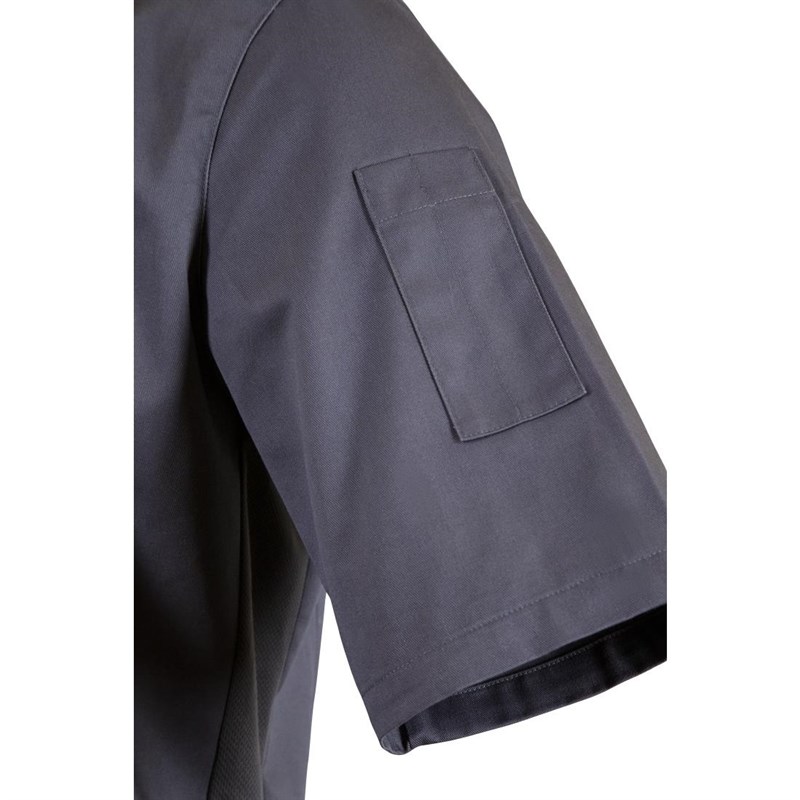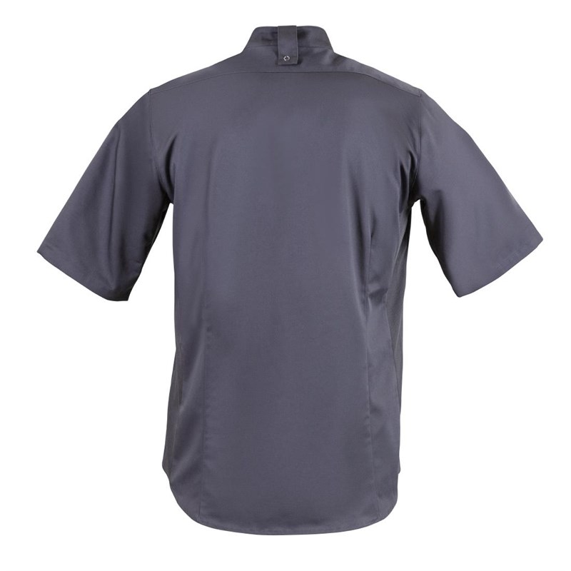Southside jack met bandkraag is gemaakt van lichtgewicht 190 gram materiaal, heeft korte mouwen en heeft een Cool Vent paneel aan beide zijden - ideaal voor een hete en drukke commerciële keuken.