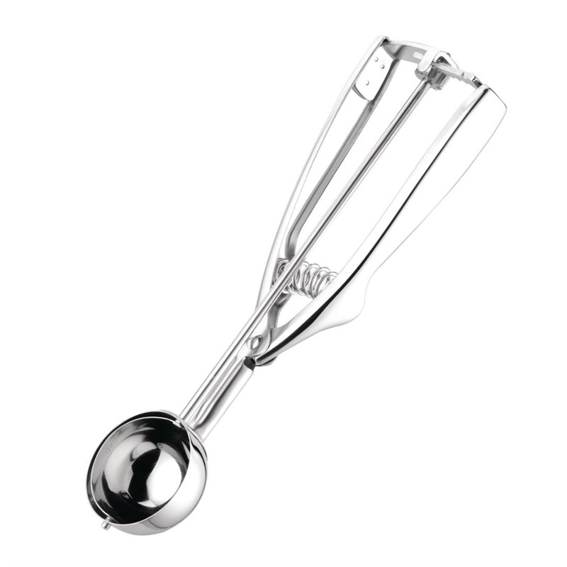 Deze portioneerlepel van topkwaliteit RVS is geschikt als ijsboltang of voor het portioneren van aardappelpuree, rijst en nog veel meer. U lost de inhoud eenvoudig door in het handvat met veer te knijpen. Uw presentatie wordt zo niet alleen veel netter, maar u kunt ook gelijke porties maken.