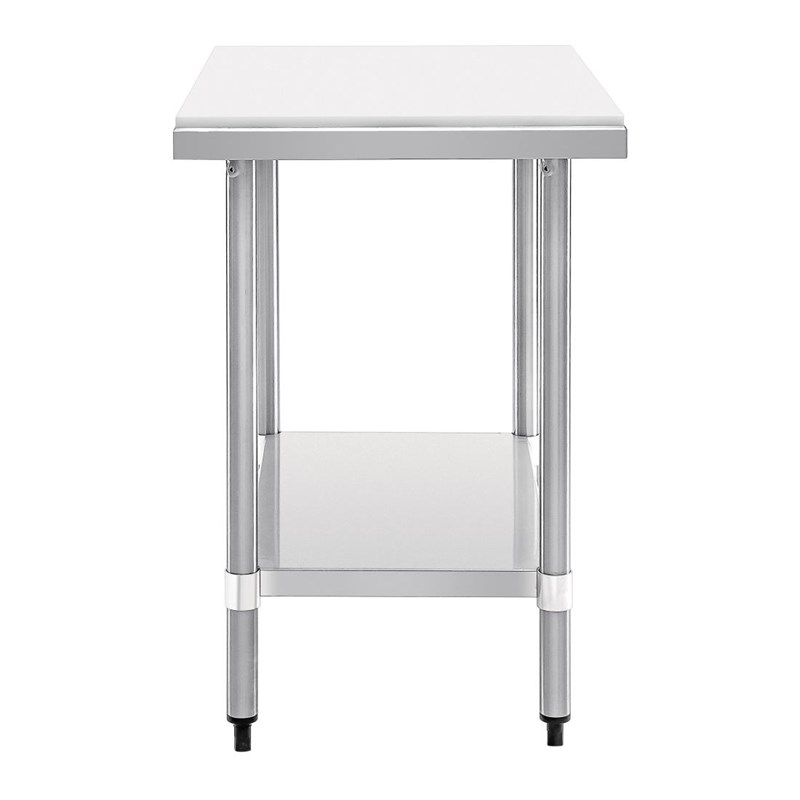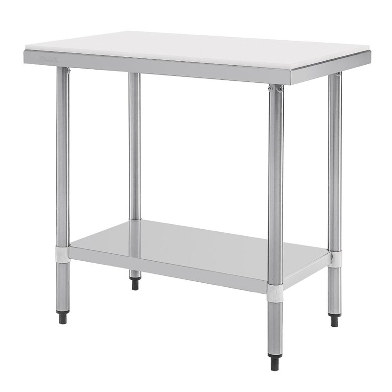 Deze RVS werktafel van Vogue heeft als werkblad een omkeerbare snijplank. Zo heeft u veel ruimte om bijvoorbeeld groenten te snijden en vis te fileren. De snijplank is gemaakt van kunststof met een hoge dichtheid en gaat daardoor lang mee in zelfs de meest drukke en veeleisende keukens. Het stalen frame en onderblad bieden goede ondersteuning en zijn eenvoudig te reinigen. Een hygiënische unit, perfect voor professioneel gebruik.
